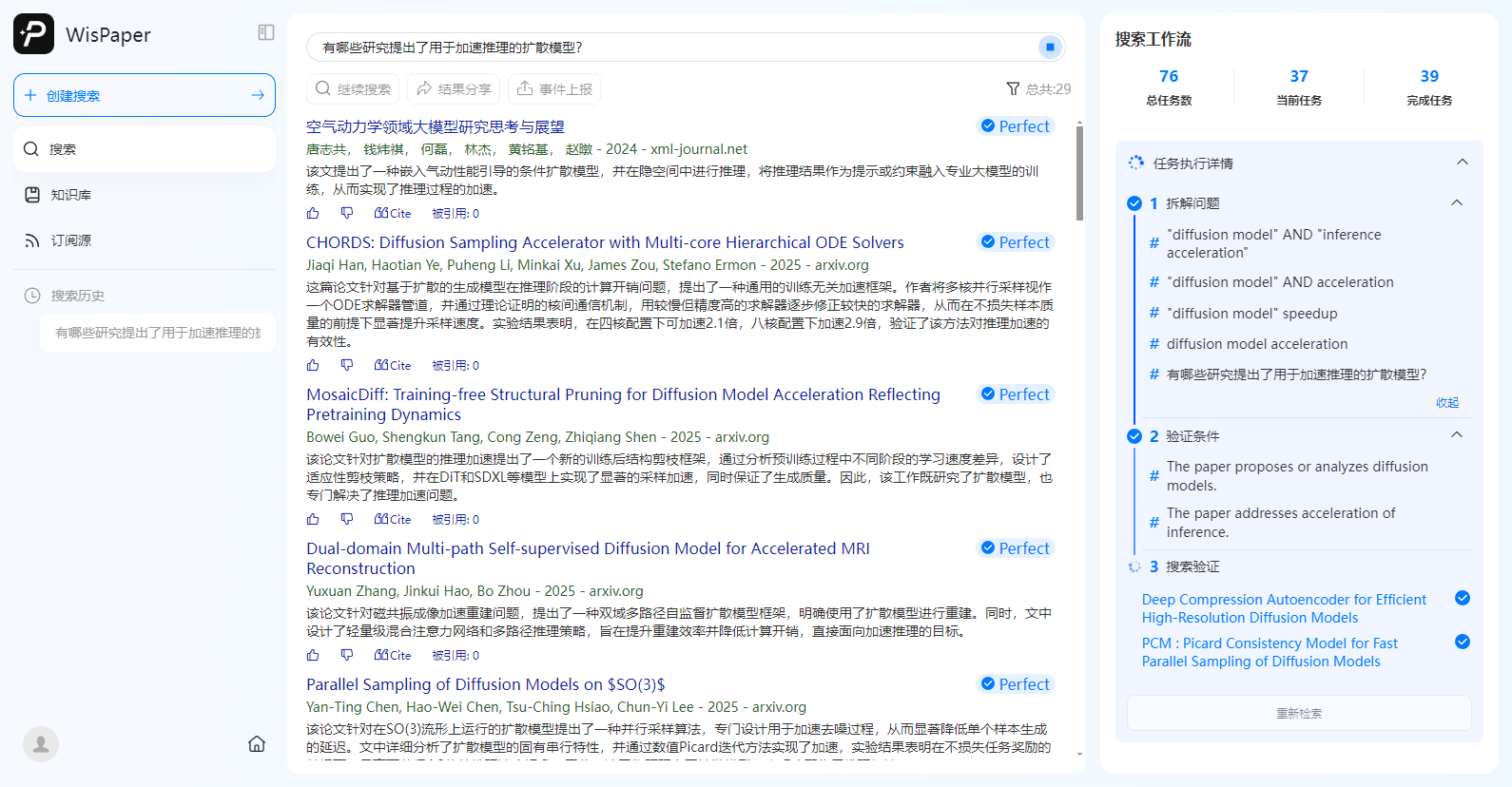 当你输入研究主题或问题时,系统会自动拆解检索意图、优化关键词,并从主流学术数据库(如 Google Scholar)中筛选出最相关的文献,还会标出“Perfect”标签,代表这篇论文与主题 100% 匹配。