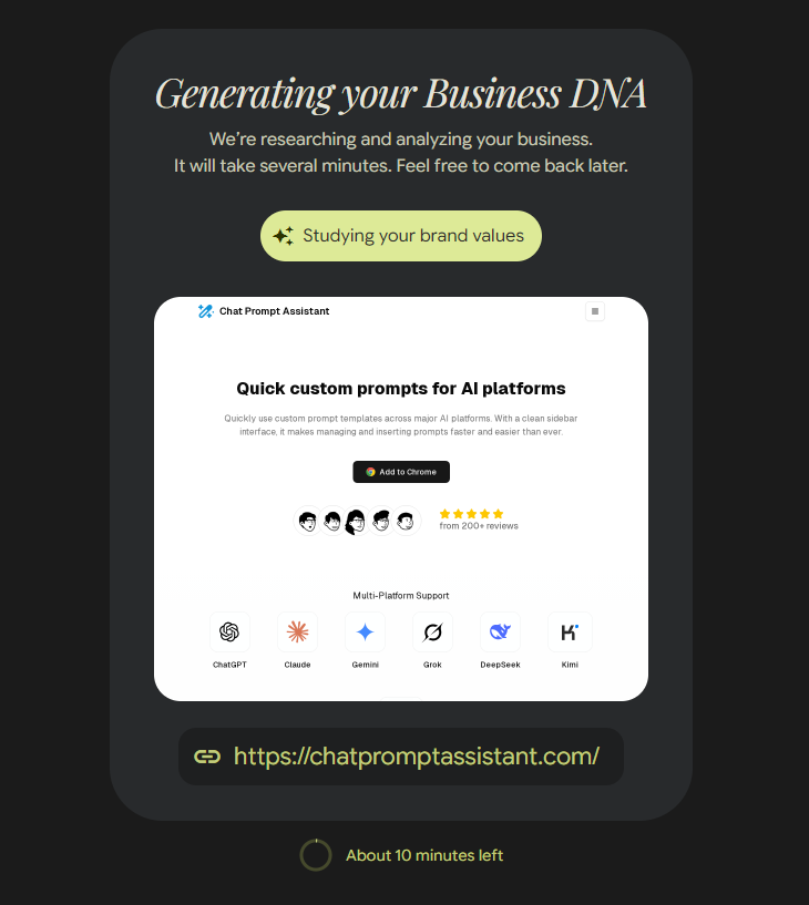 我输入了熟悉的独立设计工具 的地址。Pomelli 会自动开始分析网站,提取品牌的各种视觉要素,包括主色调、Logo、字体、核心文案、产品定位关键词等。