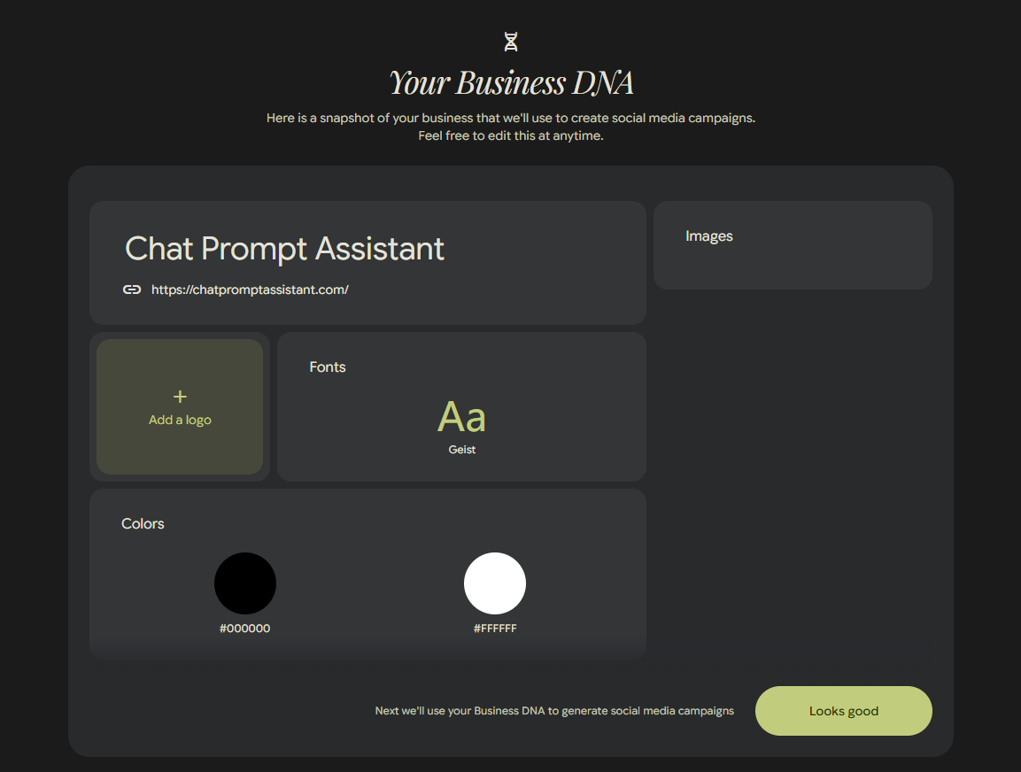 在品牌 DNA 确认无误后,点击「Looks good」进入生成阶段。