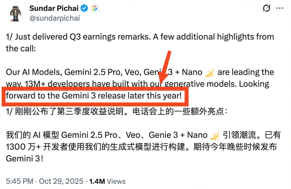 Alphabet Q3 财报电话会上,Sundar Pichai 首次明确了 Gemini 3 的发布时间窗口