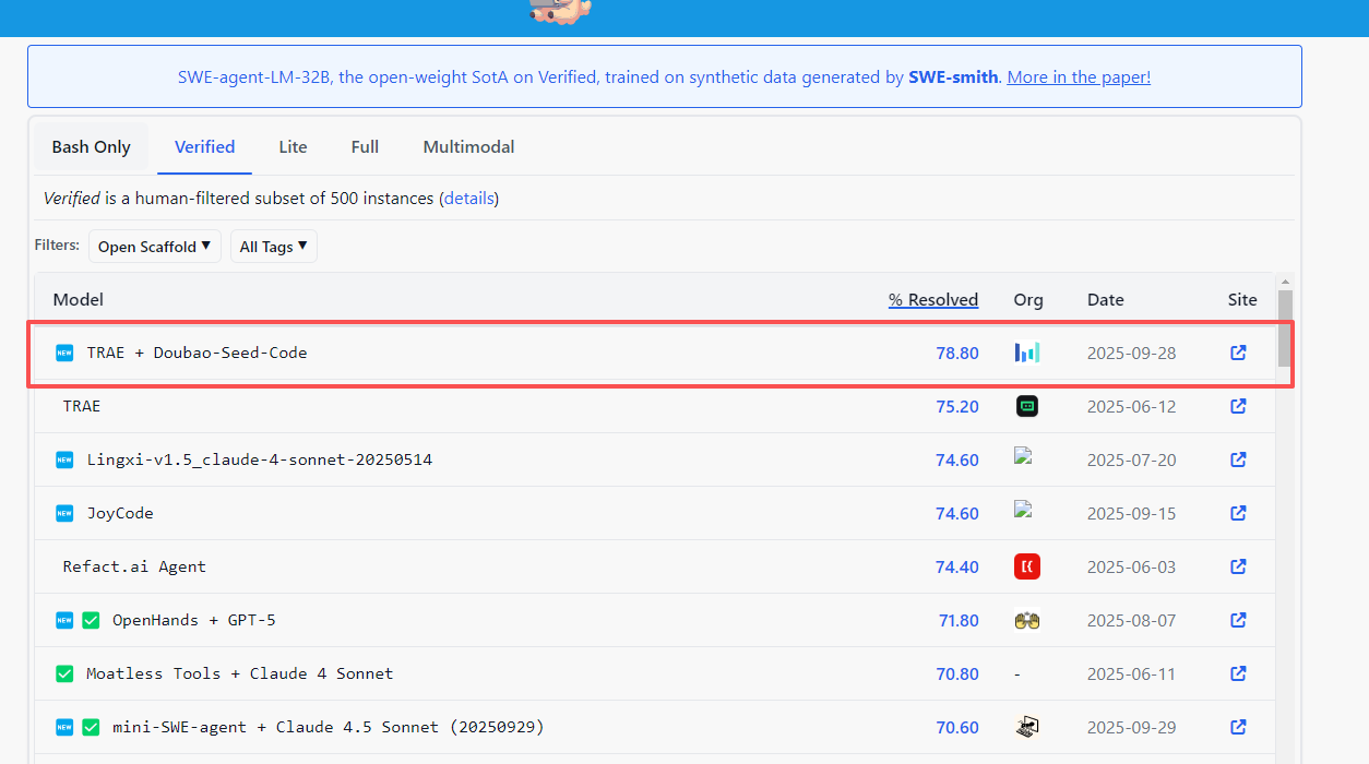 模型 Doubao-Seed-Code 与工具 Trae 深度结合后,在 SWE-Bench Verified 榜单中达到了 78.80% 的成绩,超过了 TRAE 单独使用时的 75.2%,位居榜首。