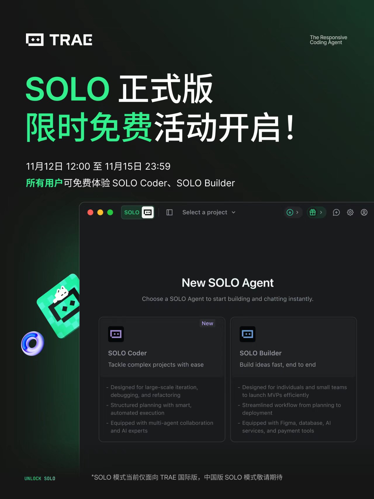 为了让所有用户都能体验全新升级、全面开放的 SOLO 正式版,作为 The Responsive Coding Agent 带来的高度自动化的开发方式,我们的限时免费活动同步开启!