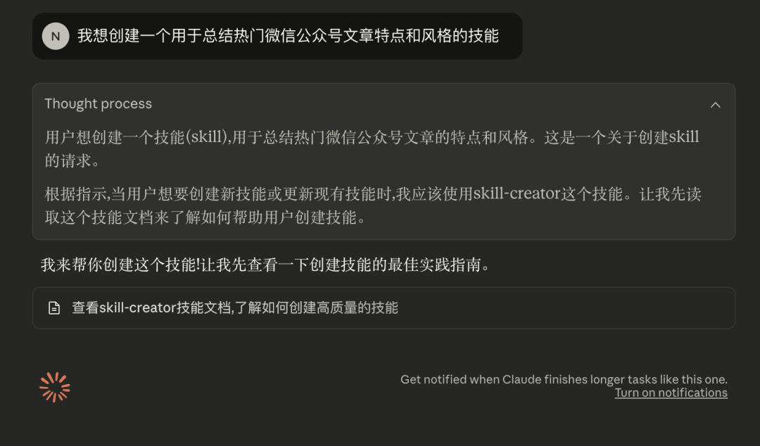 验证方法:在Claude的"思考过程"中,若出现 Using [你的Skill名字] 的提示,说明成功激活。(如未自动识别,可在对话中直接提及Skill名字)