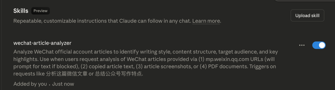 测试触发:开启新对话,输入实际使用场景,如"帮我分析这篇公众号文章的风格特点。"