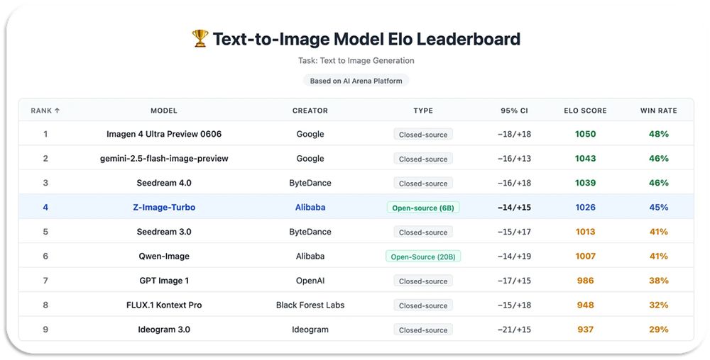 在 AI Arena 的 Elo 评估中,Z-Image 在开源模型里是领先水平,同时在一些指标上逼近商业旗舰模型。