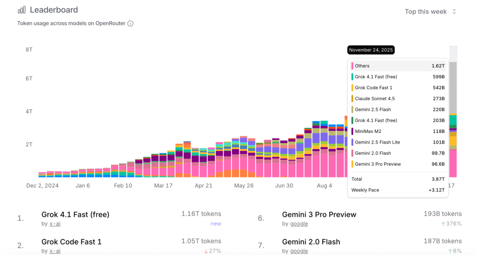 马斯克的 xAI 更是疯狂,Grok 4.1 Fast 直接免费开放,短短几天就以 1.16T tokens 的用量登顶了 OpenRouter 排行榜。