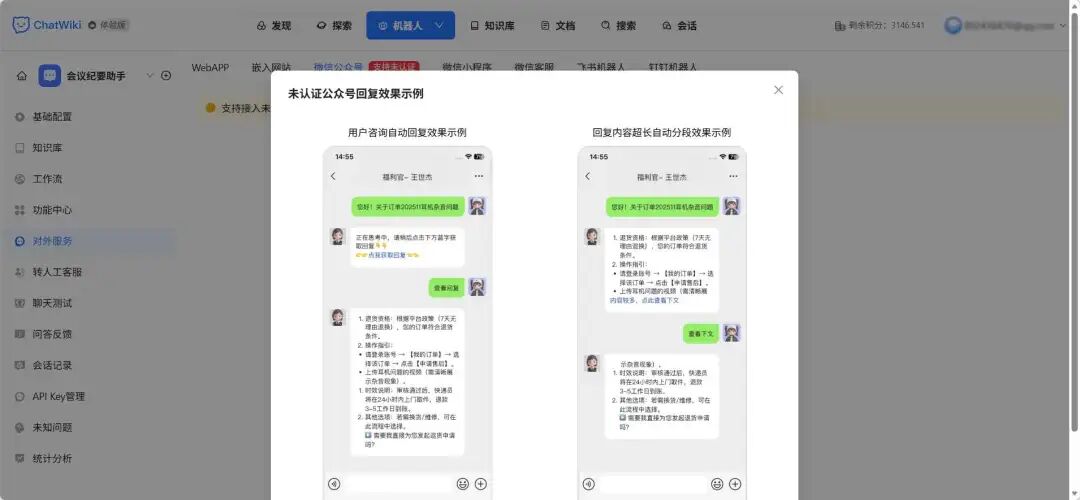 相比 Dify 的泛用性,ChatWiki 在公众号运营细节上更深入(如未认证公众号回复、内容仿写);