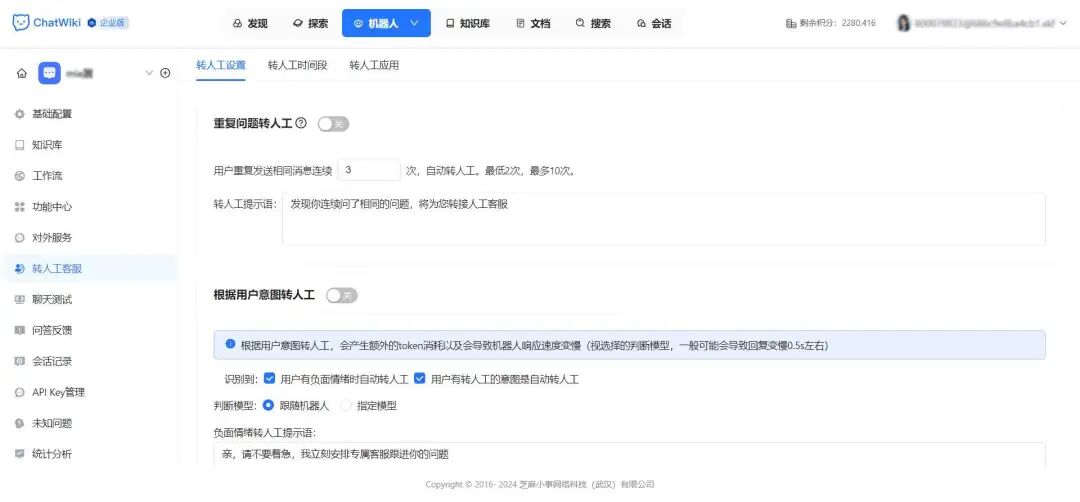 | 人工转接 | 机器人处理失败时支持转人工客服;多客服协同分配 | 确保复杂问题有人工兜底,提升用户体验 |