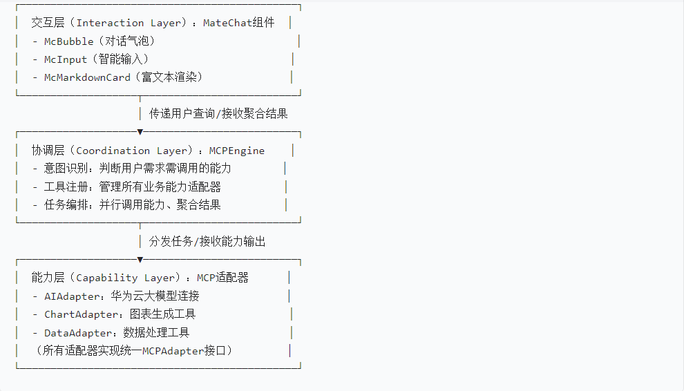 | 能力层 | 独立的业务能力实现 | AIAdapter、ChartAdapter、DataAdapter | 三个独立适配器,各自实现MCPAdapter接口。AIAdapter调用华为云AI,ChartAdapter生成图表配置,DataAdapter处理数据和指标计算 |