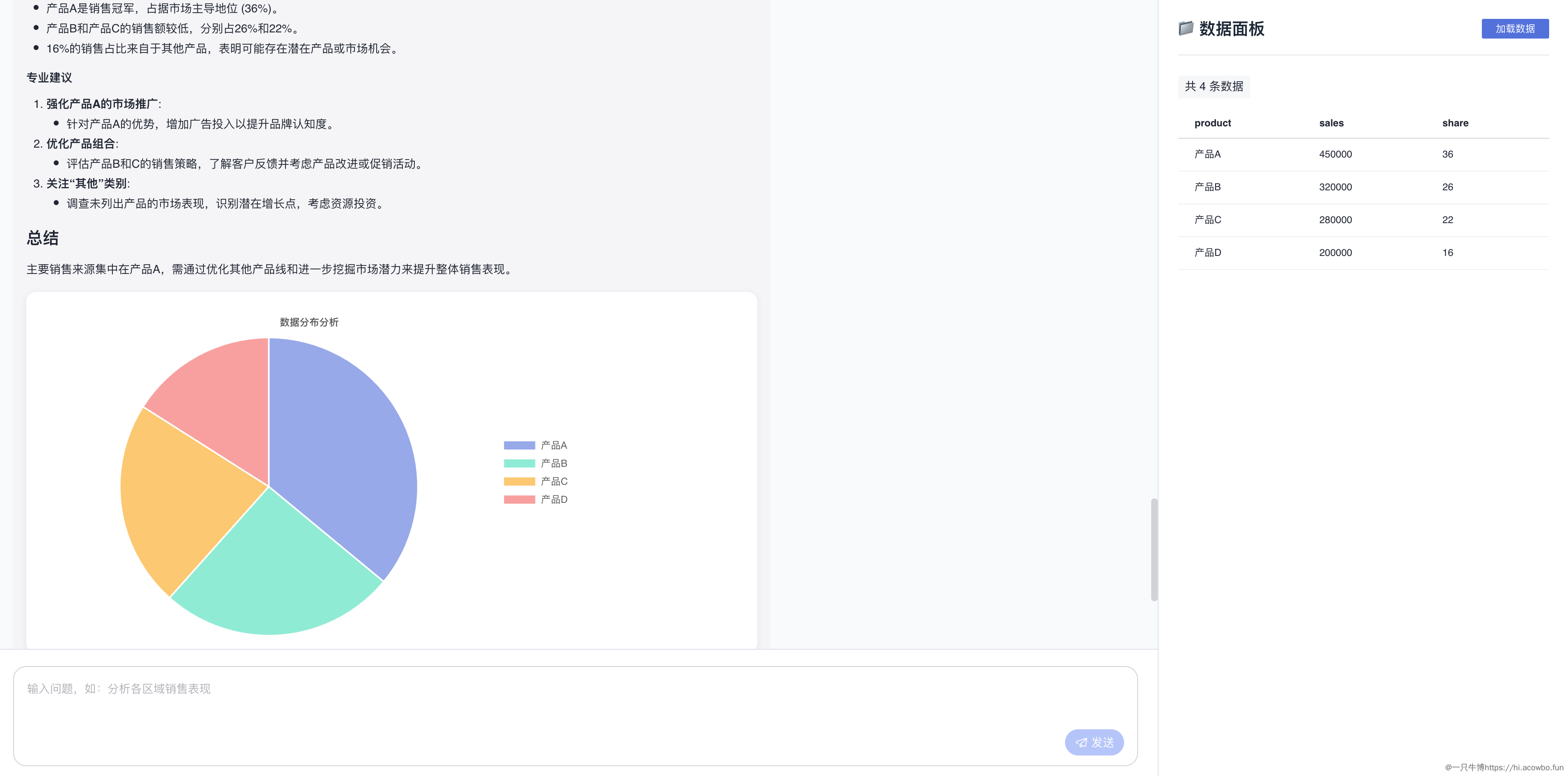 效果是什么样的?用户说一句"对比各区域销售表现",系统自动完成AI分析+图表生成+指标计算,2.5秒内返回包含文本解读、可视化图表和数据指标的完整分析结果。
