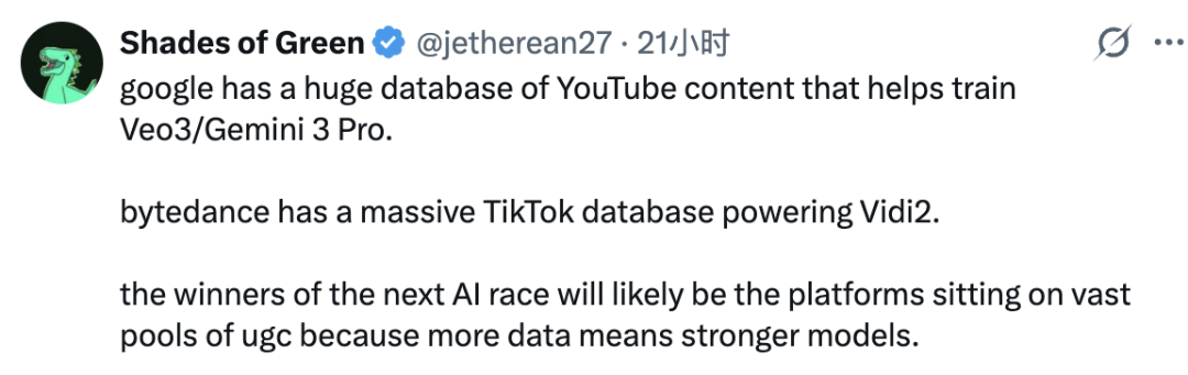 总之,在Vidi2当中,数据确实扮演了很重要的角色,如这位网友所说,谷歌Gemini和Veo 3做的好,是因为手里有YouTube当中的视频数据。