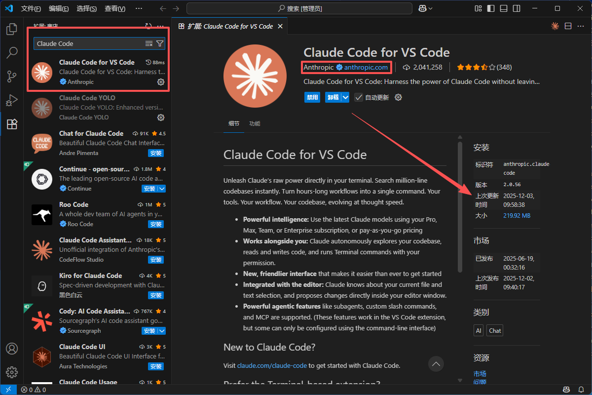 直接在Vscode的扩展搜索Claude Code,记住是这个带Anthropic认证标的