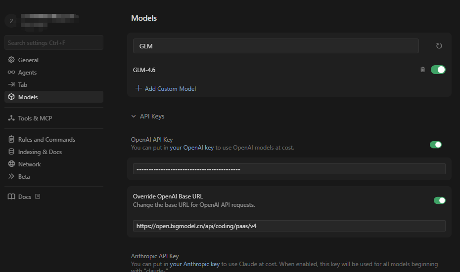 OpenAI Base URL 中,将默认 URL 替换为 GLM-4.6 的接口地址: