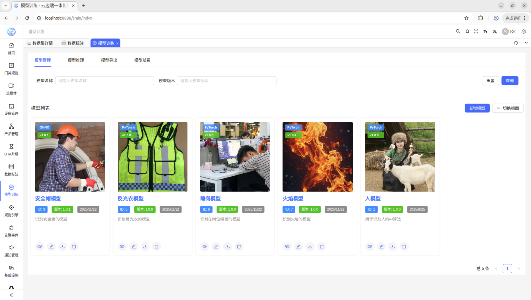 采用现代化前端技术栈,统一的操作入口覆盖设备配置、模型管理、数据分析。集成WebRTC实现实时音视频交互,满足监控场景的基本需求。Element Plus组件库保证UI的一致性。