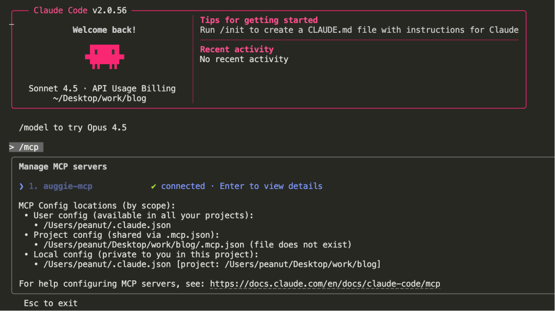 配置完成后,在Claude Code中输入/mcp命令查看服务状态,验证auggie-mcp是否正确注册。