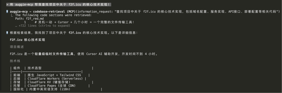 此时可在对话中通过调用auggie-mcp工具进行代码检索。
