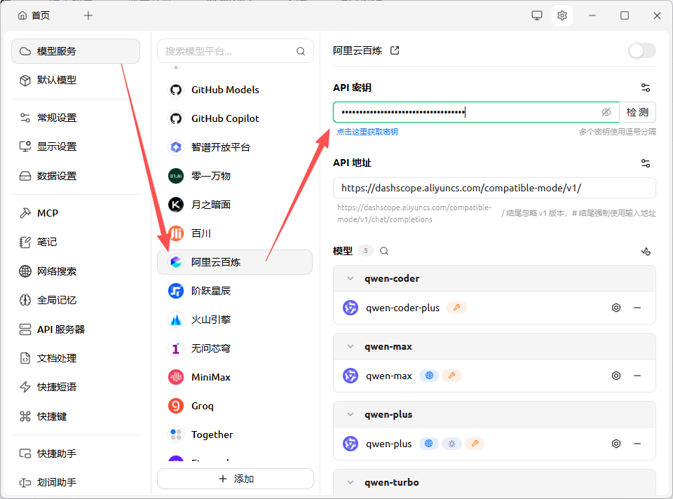 进入工具的【模型管理】 → 找到【阿里云百炼】选项。