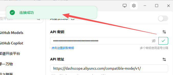 测试配置后,提示“连接成功”即可正常调用阿里云的大模型服务了。