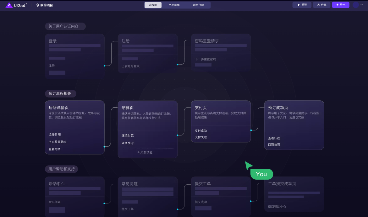 输入文字描述或上传参考图片,UXbot在10分钟内生成完整的多页面原型,包括页面流程、交互逻辑和视觉设计。这个过程涵盖了传统的产品、设计两个阶段。