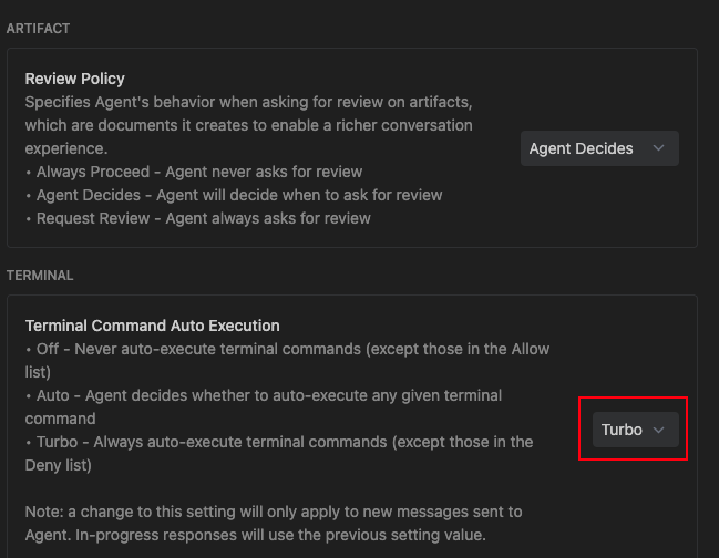 首次使用Antigravity时,进入设置界面,将终端模式从默认模式切换为Turbo模式。