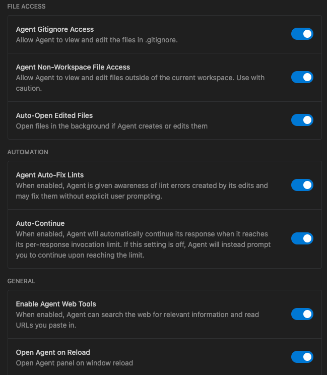 | Open Agent on Reload | 窗口重新加载时自动打开AI助手面板 | 按习惯选择 |