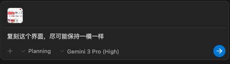 复现网站的步骤相对简单:对目标网站进行截图 - 将截图上传到Antigravity - 输入简明的复现指令 - AI自动生成HTML+CSS代码