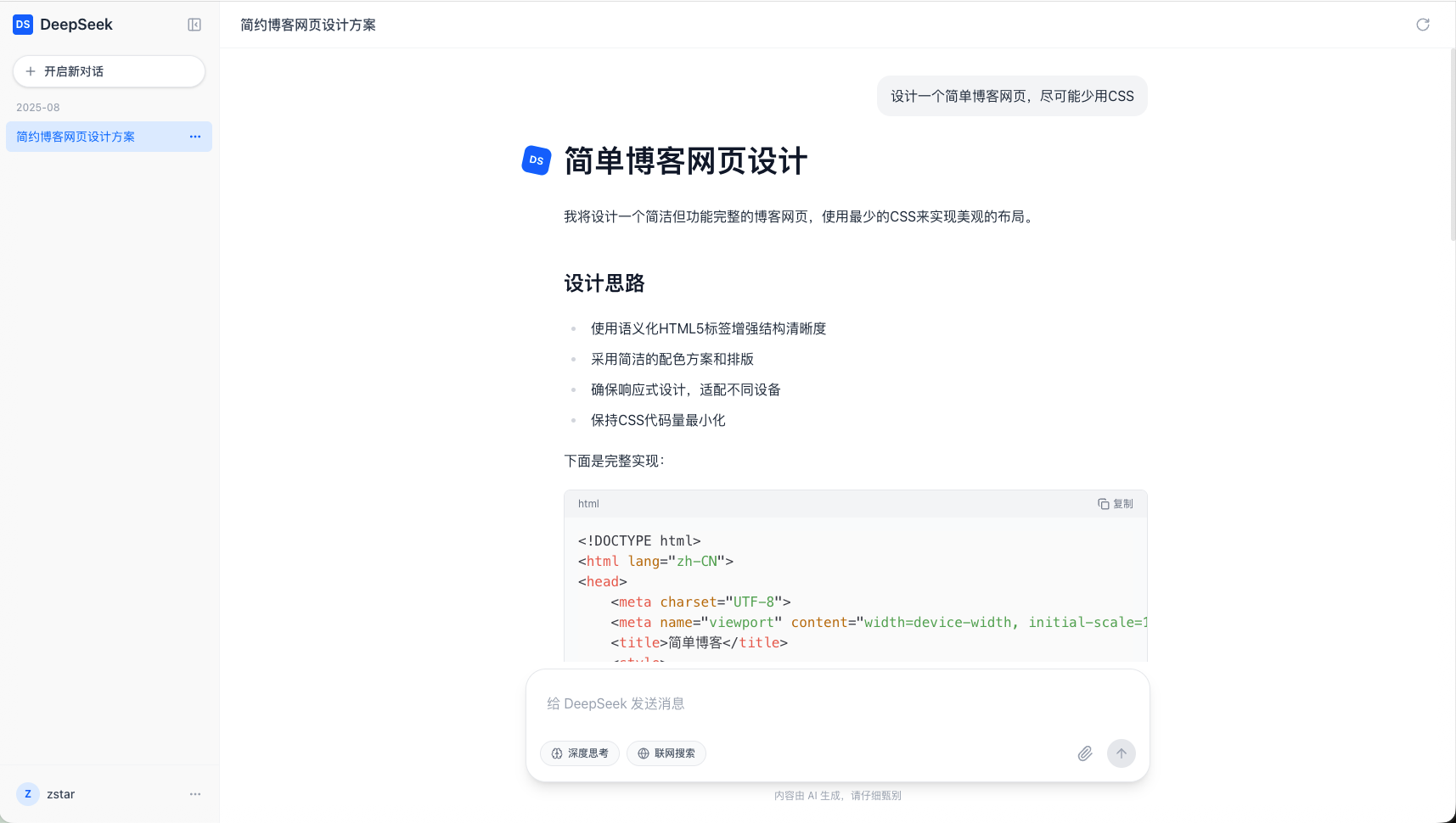 复现特点:DeepSeek首页和对话页的布局相对规整,以卡片式设计为主。通过截图上传后,AI能准确识别布局结构,生成的仿制版本在视觉层面达到90%以上的还原度。