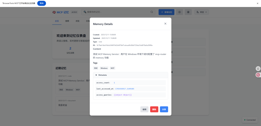- 工具列表:确认40+个工具可用(store_memory、retrieve_memory、search_by_tag等)