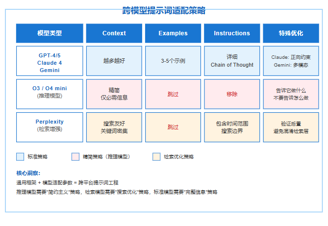 对 GPT、Claude、Gemini 用完整框架并善用示例;对 O3/O4 mini 精简到角色、任务、输出;对 Perplexity 优化上下文的搜索友好性。