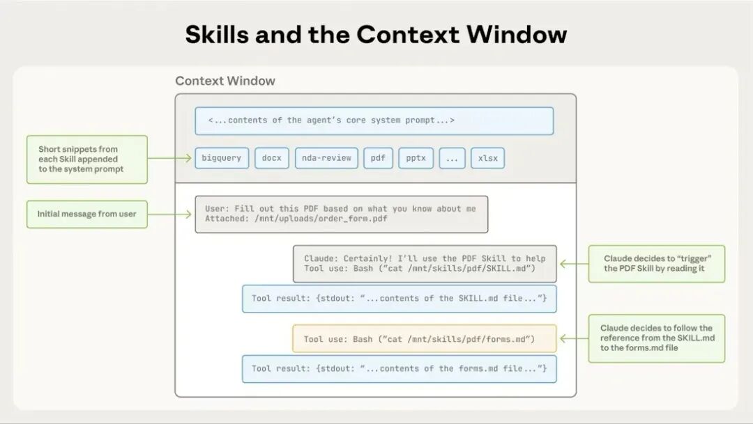 只有此时,Skill 的具体指令和工作流程才进入上下文窗口,Agent 由此学习如何执行具体任务。