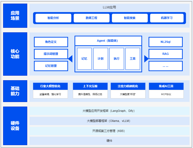 分别是:应用场景层、核心功能层、基础能力层、硬件与框架层。