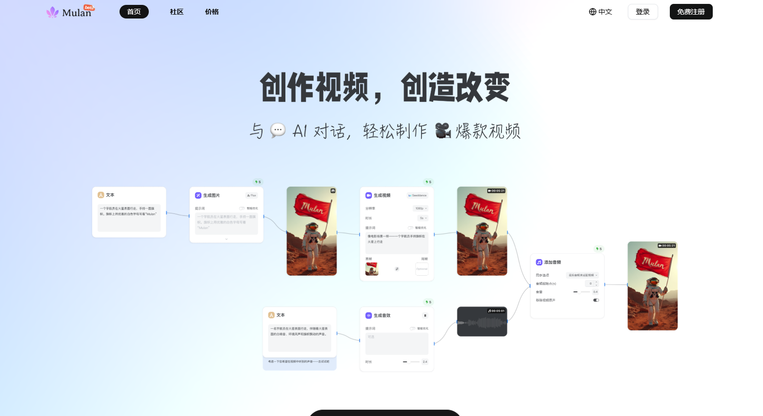 从产品视角看,Mulan 的价值在于把「视频创作」拆解成可视节点,并形成可复用与可批量的流程资产。这对追求规模化产出的团队,是更可控的路径。使用前明确边界(时长、分辨率、成本、合规),落地时配套治理(模板、素材库、审查与监控)。如果你的目标是系列化短视频的稳定产出,Mulan 的工作流思路值得优先试用;如果目标是复杂长片与精细包装,可以把它作为生成环节的补充,与专业剪辑工具协同。