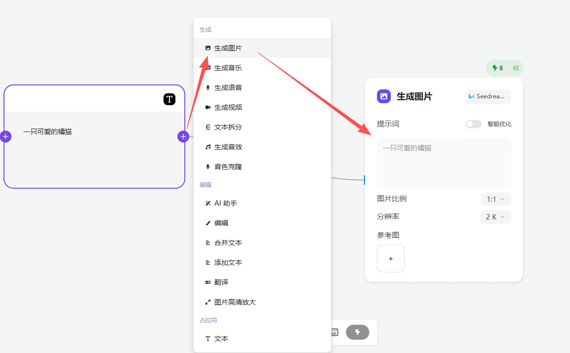 - 生成节点:生成图片、生成视频、生成音乐/语音、获取音频、获取首帧/尾帧、图片倒推提示词、语音转文字(ASR)、生成音等。