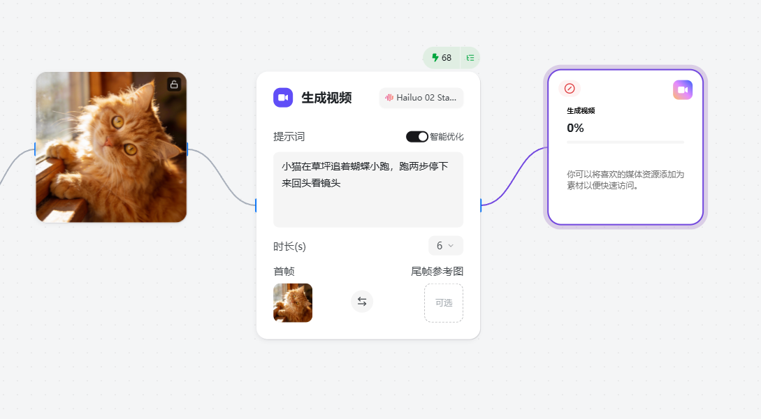添加「生成视频节点」,基于参考图与视频描述提示词生成短视频。