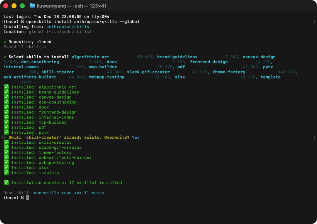 命令执行后,会交互式地让你选择要安装的 Skill,同步完成后,这些 Skill 将在 Qoder 中始终生效。