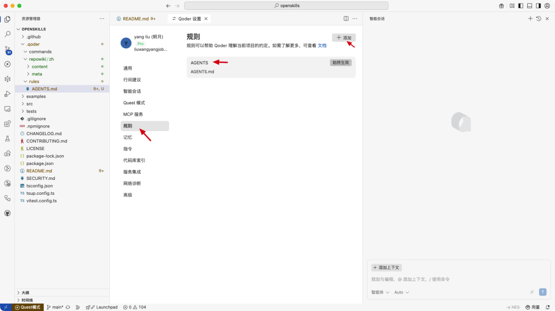 在 Qoder 的「规则」中新增一个 AGENTS.md 文件(初始为空)。