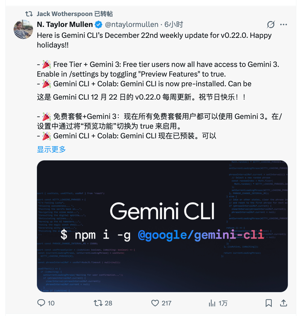 Gemini CLI 团队在 v0.22.0 版本更新中,为免费用户提供了访问 Gemini 3 模型的入口。