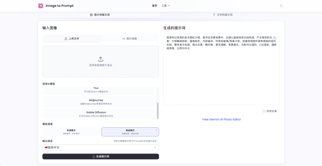 - 图片转提示词:支持Flux1、Stable Diffusion、Midjourney等平台