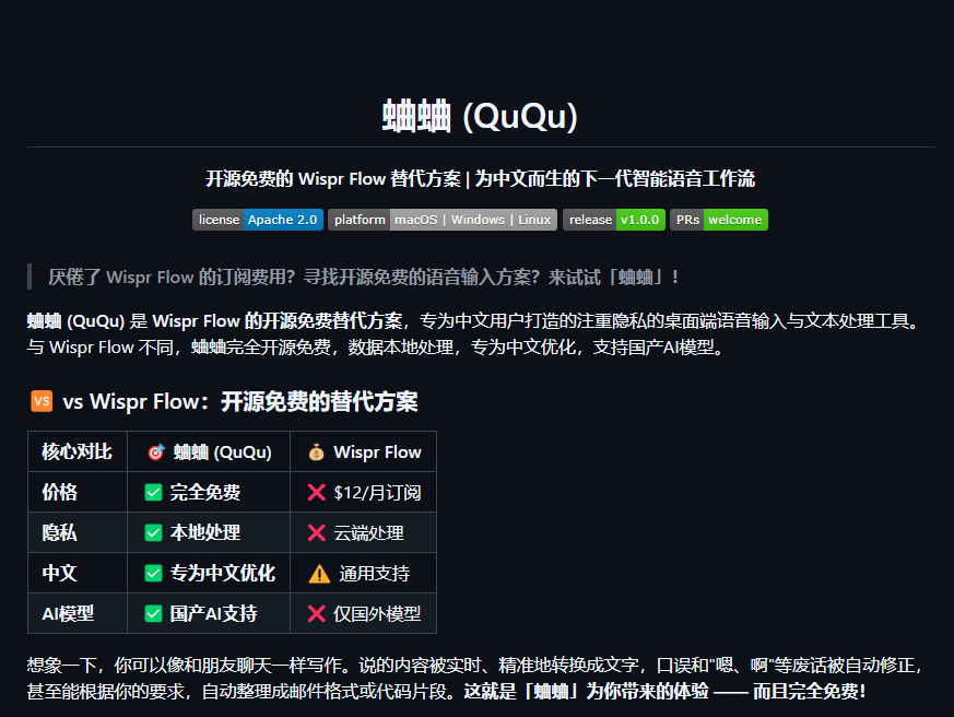 简介:Wispr Flow 的开源免费替代方案,专为中文用户打造的隐私优先型桌面语音输入工具。