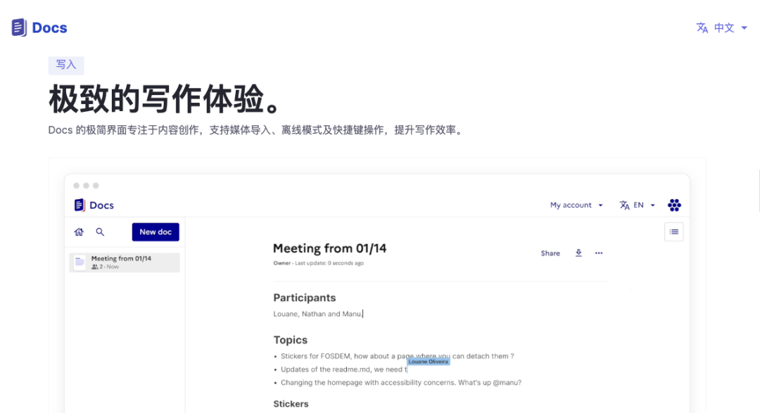 La Suite Docs 以开源协作编辑器的身份,结合了实时多人编辑、内置AI辅助、灵活部署等特性。从产品设计角度看,它的强项在于: