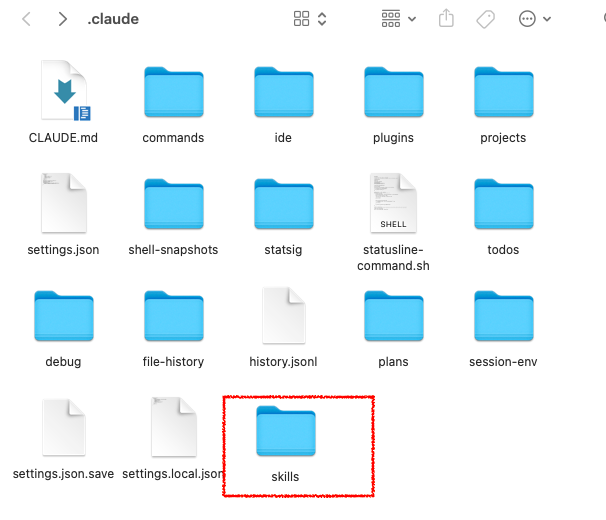 Skills 本质上是一个标准化的文件夹,需要放置在 ~/.claude/skills 目录下。