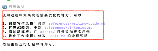生成后即可测试使用。如有改进需求,既可手动编辑 Skill 文件,也可直接告诉 Claude 修改意见,由其自动更新。