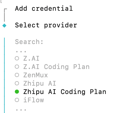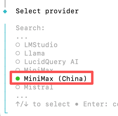 根据终端提示,用上下键选择供应商,然后输入对应的 API Key。整个过程无需额外的 OAuth 授权跳转,仅需一个有效的 API 密钥。