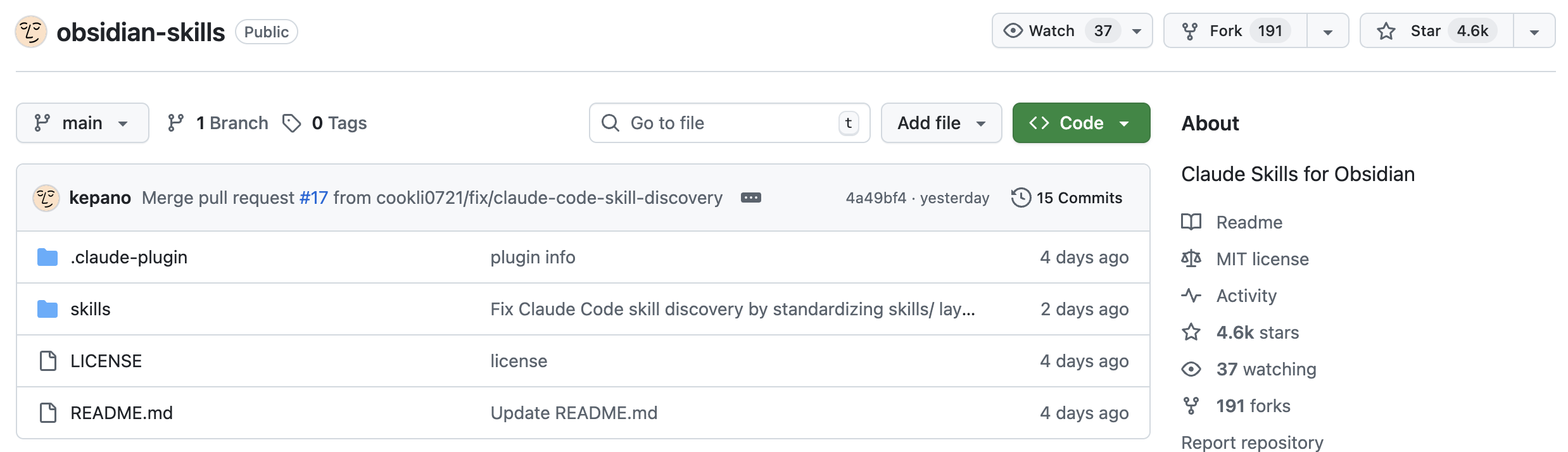 - 在Claude Code中加载项目:输入指向 https://github.com/kepano/obsidian-skills 的安装命令