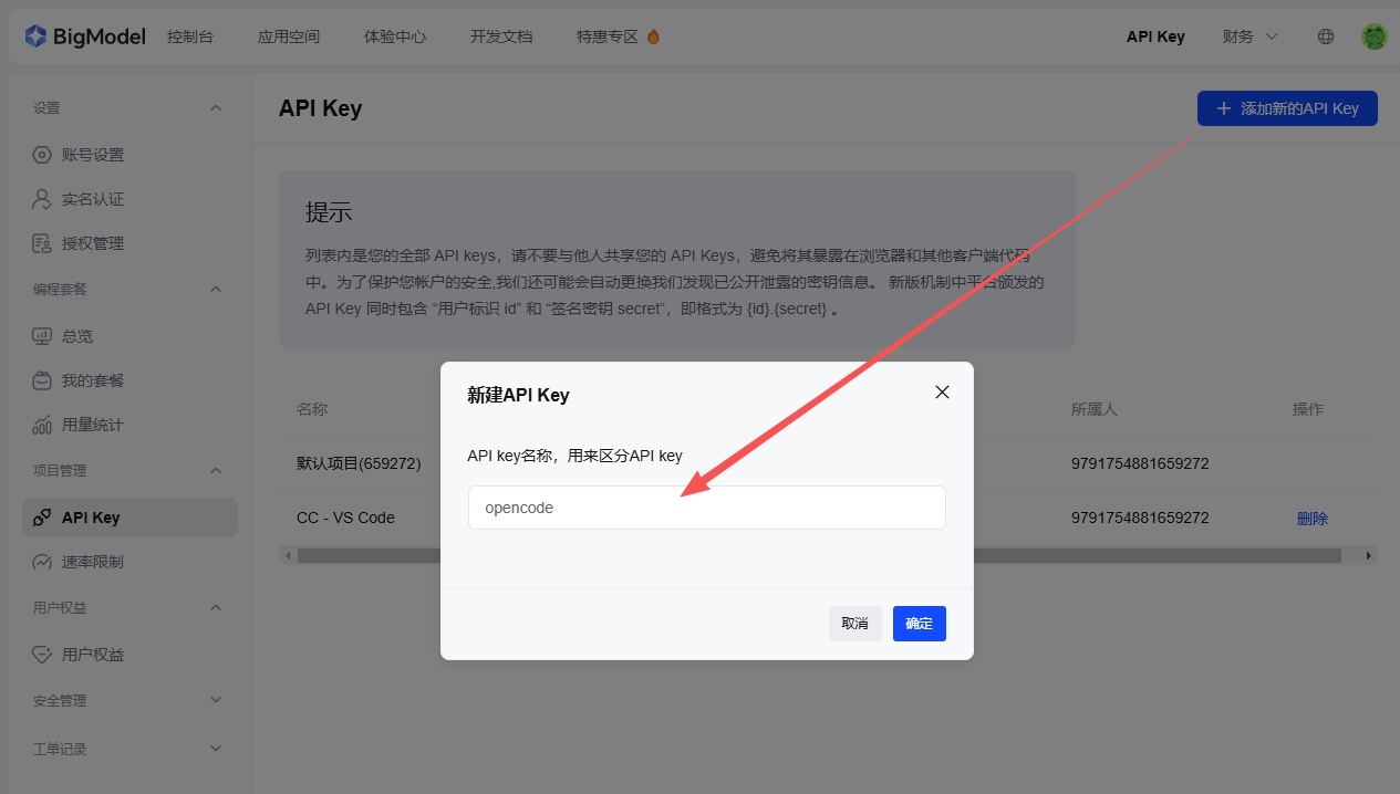 先访问智谱 Bigmodel 开放平台,获取你的 API key。