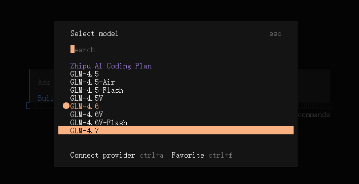 回到opencode使用 /models 命令来选择模型GLM-4.7