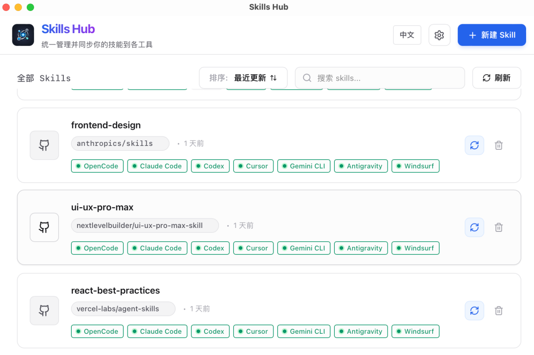 - 实时显示每个Skill在哪些工具上生效