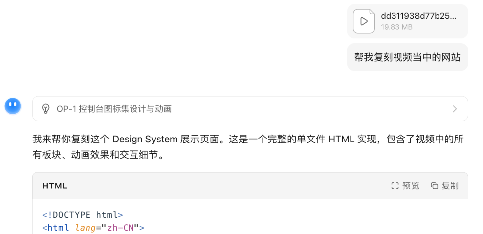 拖拽上传参考视频,提示“帮我复刻视频当中的网站”。