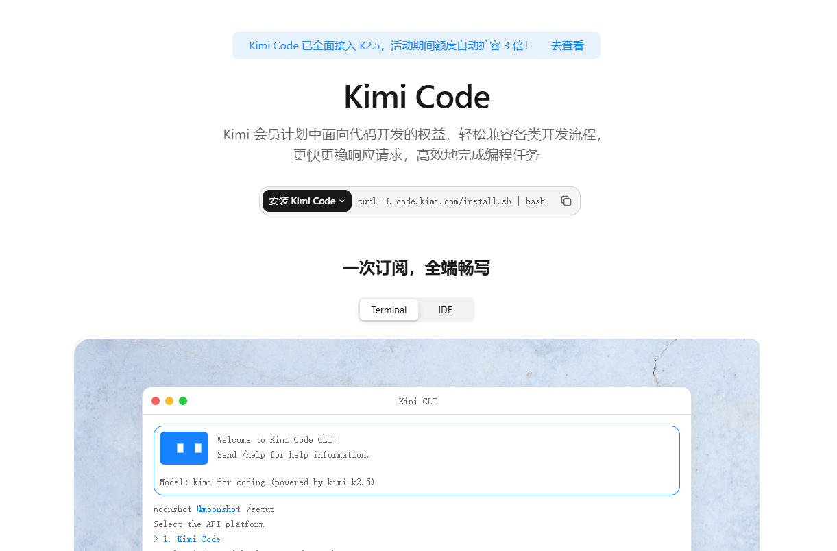 安装:在终端执行“curl -LsSf https://code.kimi.com/install.sh | bash”。