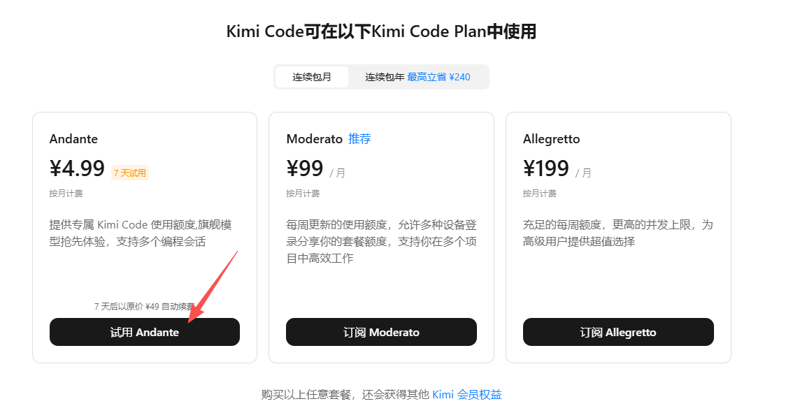 目前4.9元Andante版套餐可7 天试用,试用过后是49元/月的定价(官网和Kimi Code同步)